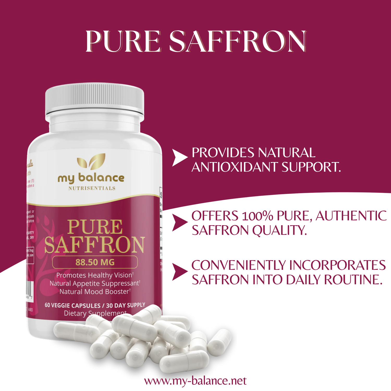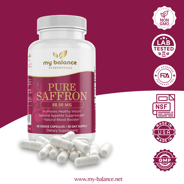 Pure Saffron capsules offer a consistent, convenient serving of saffron extract without the need for measuring or cooking.